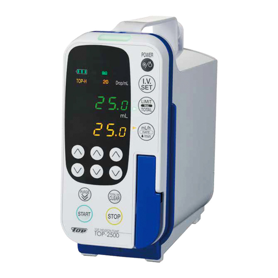 The TOP-2500 is a volume pump, used to administer medical fluids in a controlled and preset manner, for a broad variety of infusion therapies. It was developed as a New Standard: a very light and compact machine, with a clear focus on simplicity and safety. Preparation and use are very straightforward, following a well indicated series of successive top-to-bottom steps.